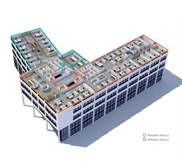 Jedes der insgesamt neun Geschosse ist als Teilfläche mietbar. Open Space, Gruppen- oder Einzelbüros.