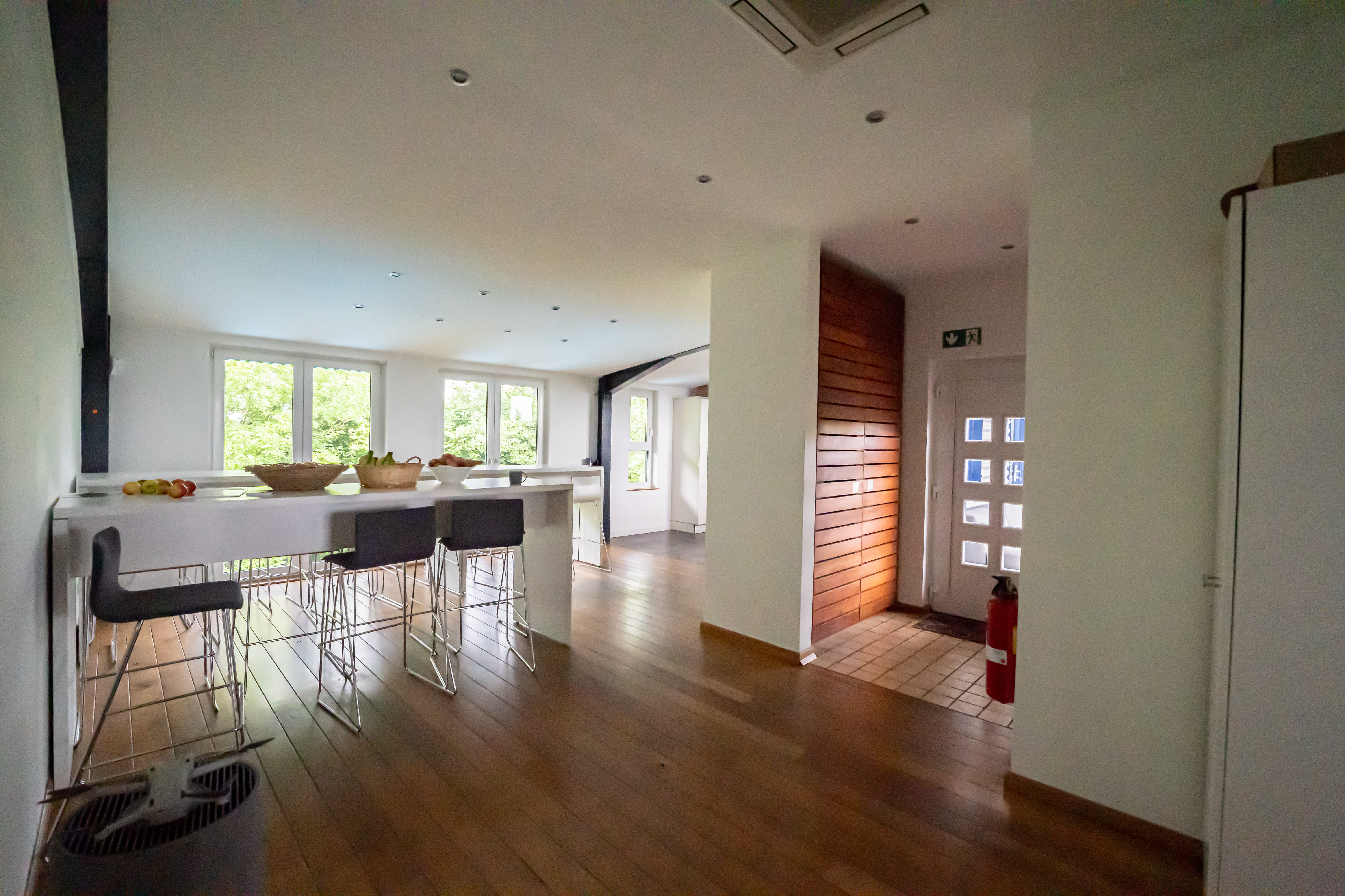 zusammen. Ebenfalls im Jahr 2003 wurde eine Gas-Brennwerttherme installiert, um die Fußbodenheizung der beiden Hallen im Erdgeschoss sowie die Fußbodenheizung der Wohnung zu betreiben und der Warmwasseraufbereitung. Nach der Umrüstung des Objekts auf ein modernes VRF-System wurde die